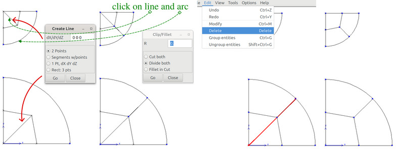 , set R to 0, select Divide both \(\longrightarrow\) Go.select the created line and the previously created arc. This will create the intersection point between the line and the arc.