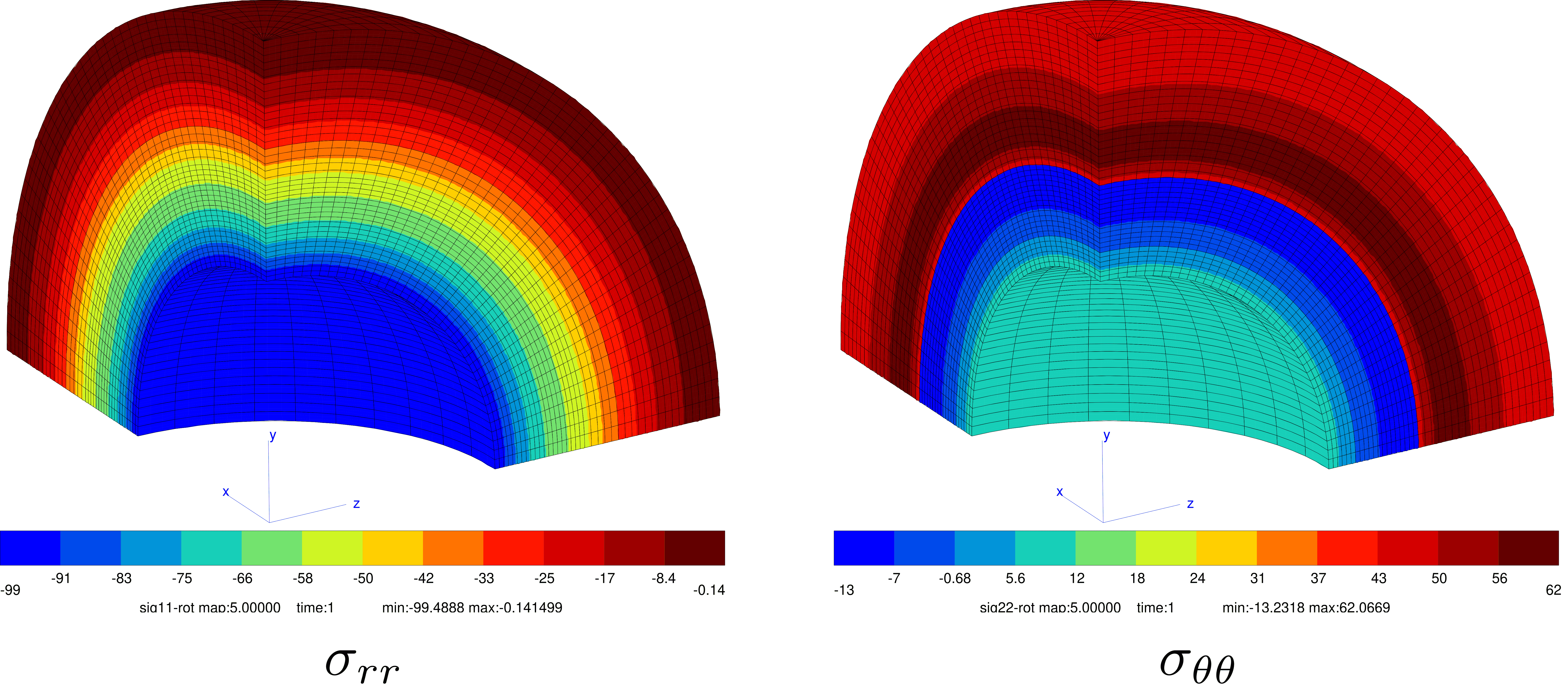 In order to get stress values in the spherical coordinates, one can use the following post-processing by adding it at