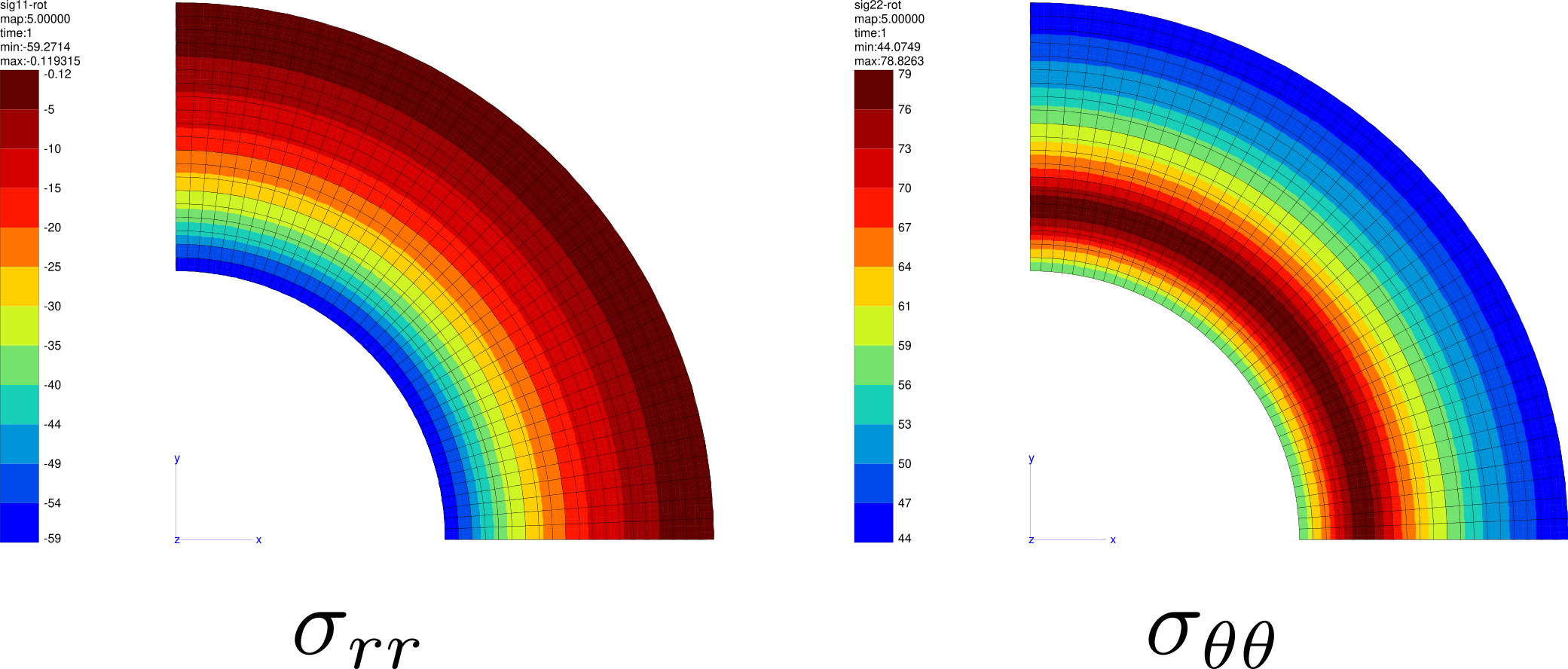 In order to get stress values in the cylindrical coordinates, one can use the following post-processing by adding it at the end of the tube.inp and use the terminal command Zrun -pp tube.inp to run it: