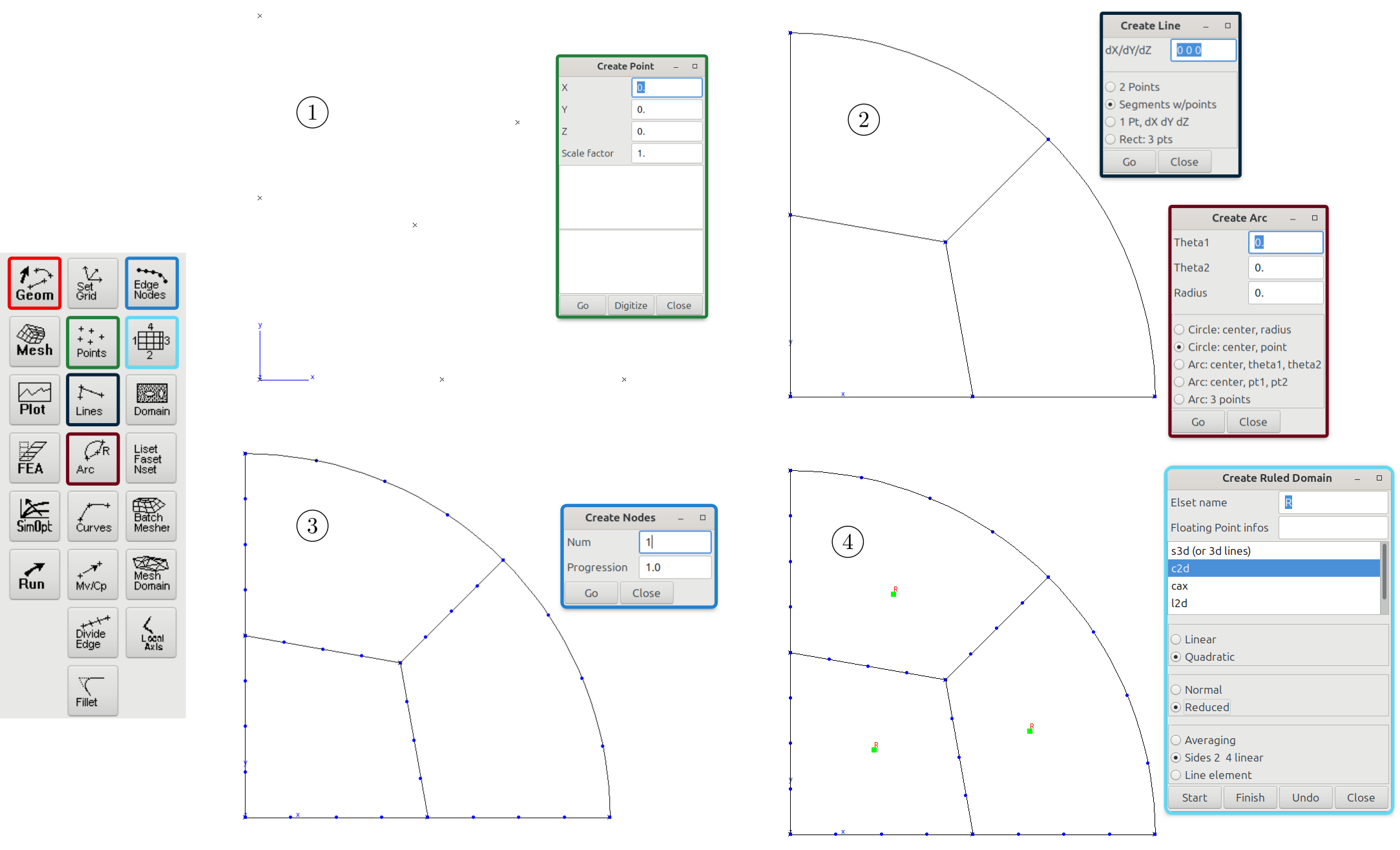 First the mesh of a quarter of a disk is created (disk_quart.mast) using Zmaster interface.