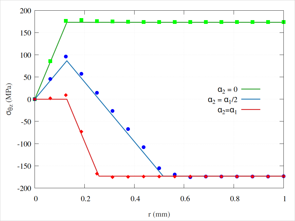 Fig. 60 The stress \(\sigma_{\theta z}\) after unloading. The solid lines represent the analytical solutions, while the marked dots correspond to FEM results. Note that FEM stress values are extrapolated to nodes.#