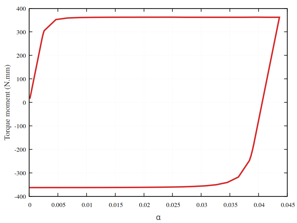 The figure Fig. 61 depicts the evolution of the torque in terms of the applied rotation angle \(\alpha\).