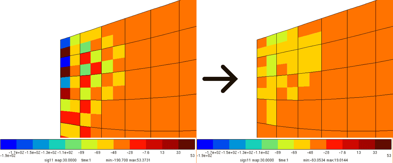 This post-processing recomputes fields (only second-order tensors, e.g., stress and strain) to remove fluctuations in the spherical part (typically pressure) within each element. The updated value \(\ten A_s\) is computed by combining the deviatoric part of \(\ten A\) with the average of its trace over the element.